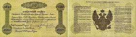 По указу от 21 сентября 1843 г. поступили в обращение знаки с нарицательной стоимостью 3, 5, 10 и 25 руб.; по указам от 2 октября 1843 г., 23 февраля и 4 октября 1844 г. увидели свет билеты достоинством 1, 50 и 100 руб.